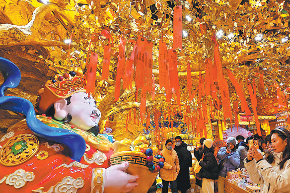 Празнуващите правят снимки на Бога на богатството в Huaxi Live в квартал Haidian, Пекин, на 31 декември. GENG FEIFEI/CHINA DAILY