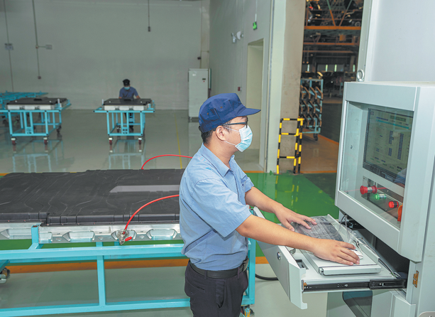 Работник инспектира батериите на чисто електрически превозни средства в производствения цех на базата на Haima Automobile в Хайкоу, провинция Хайнан, през октомври 2022 г. YUAN CHEN/ЗА КИТАЙ ДАЙЛИ
