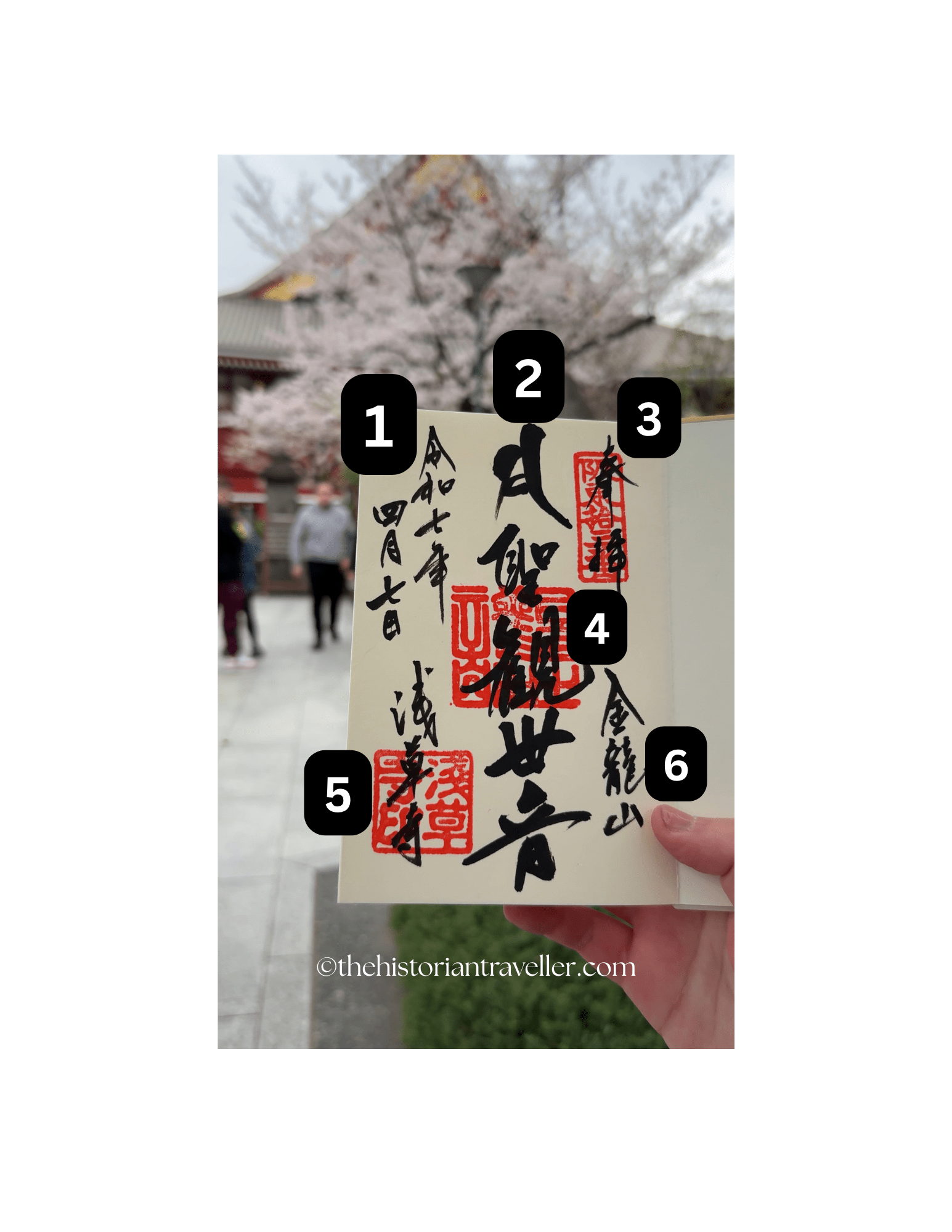1. The top left calligraphy is the date of the visit. Each goshuin has a different date depending on your visit.