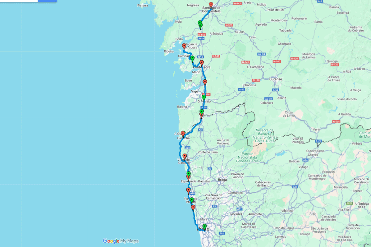 This is a Google Maps track of a Camino Portuguese path combining the Litoral, Coastal, Central paths, and the Spiritual Way. This Google maps trail can be used on a mobile phone for navigation. We produced this map following the yellow arrows with a GPS gadget. The link can just be opened while online (with Wi-Fi or data), however navigation on the track works even when offline. Click the map, make it full screen, zoom in and keep the blue dot on the trail.