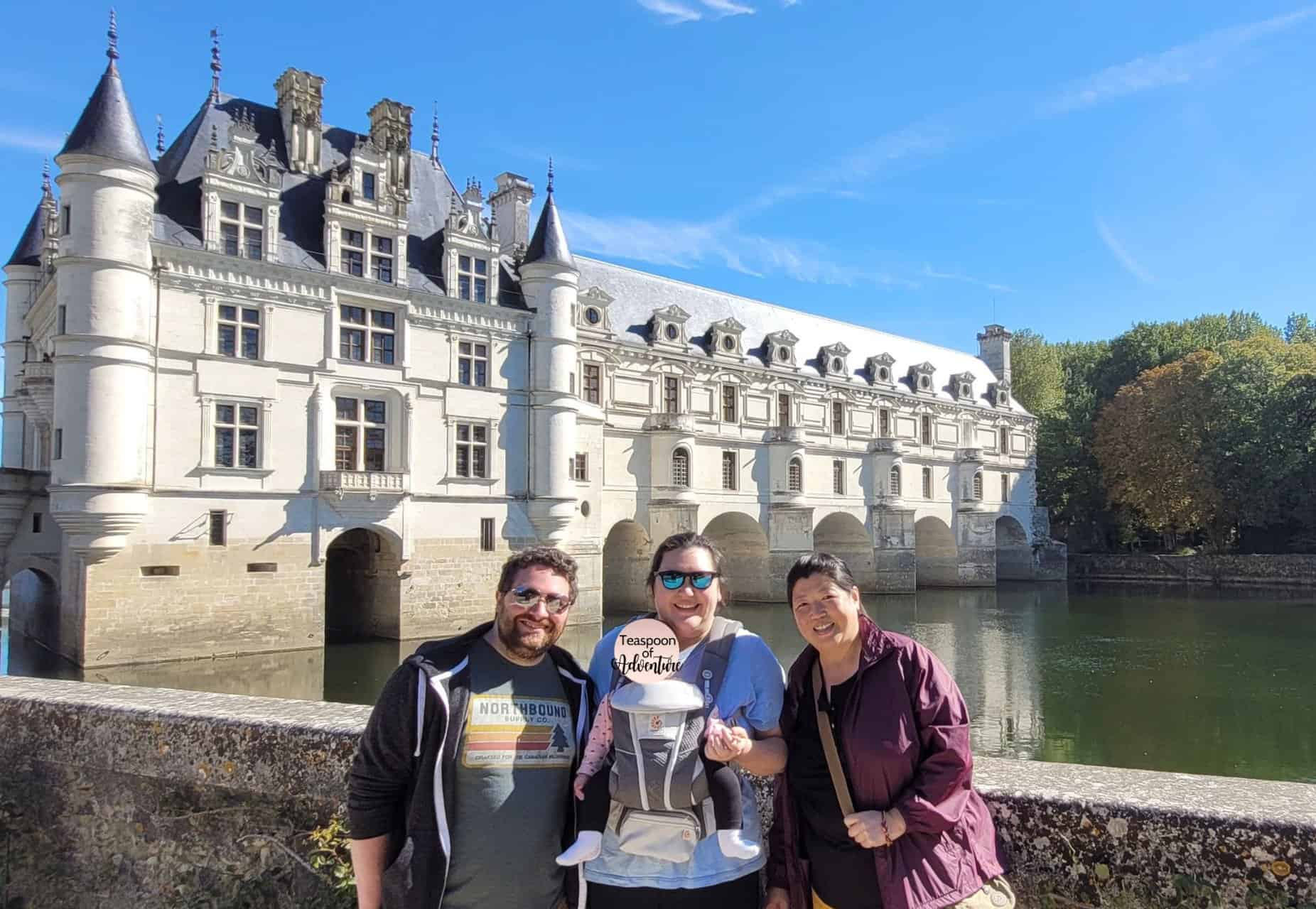 Riana, Colin and Baby C in her stroller standing in front of Chateau de Chenonceau in the Loire ValleyFamily photo at Chenonceau Castle